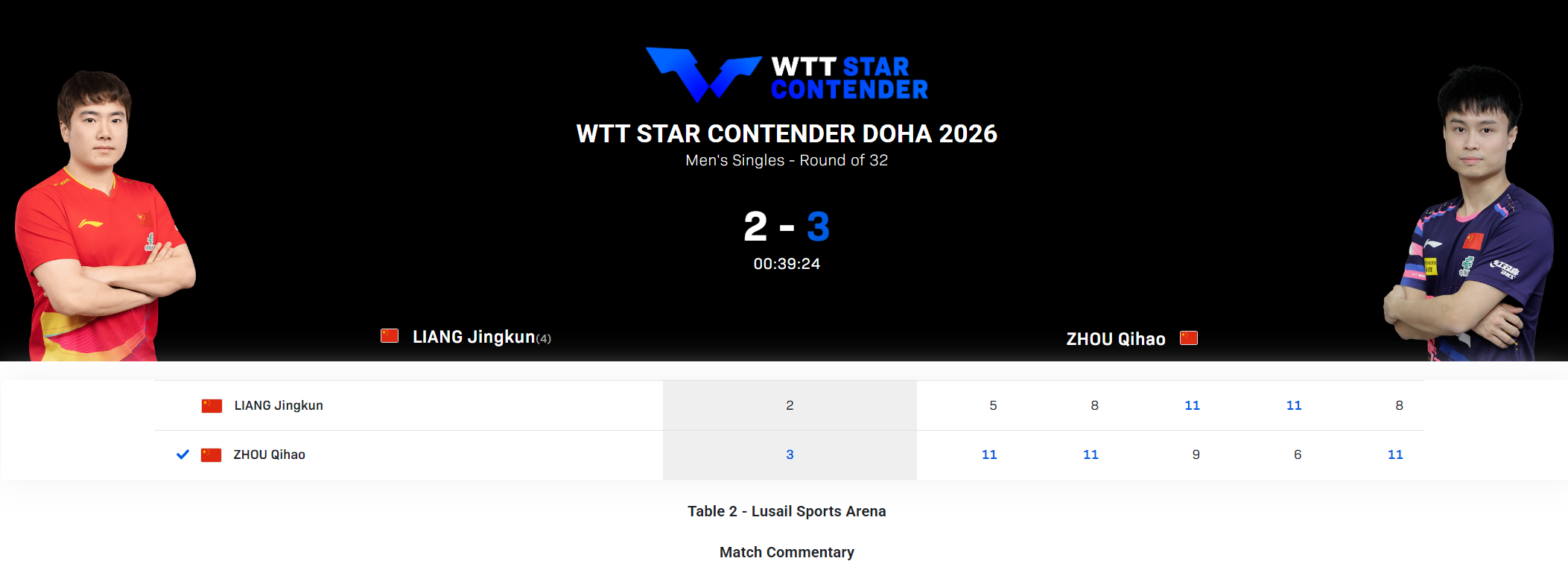 北京时间1月16日,WTT多哈球星挑战赛男单1/32决赛,国乒内战,周启豪3-2爆冷击败梁靖崑晋级,五局比分:11-5,11-8,9-11,6-11,11-8。周启豪下一轮的对手会是篠冢大登与吴晙诚之间的胜者。